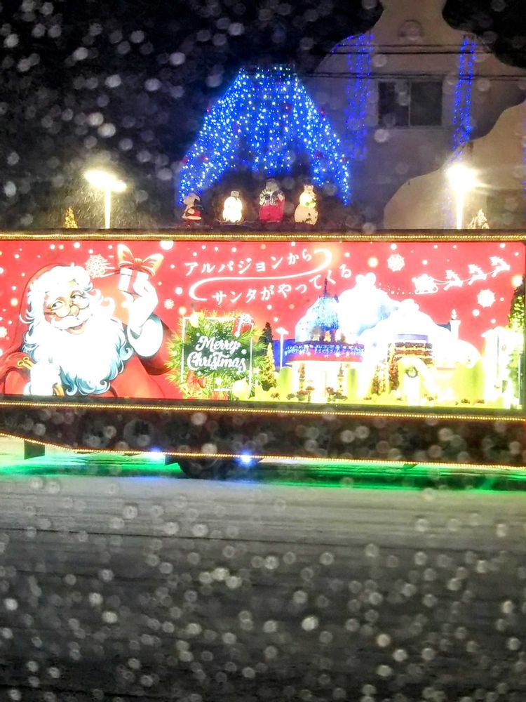 ケーキ屋さんのイベントで、サンタさんのトラックです。雪が降っています❄