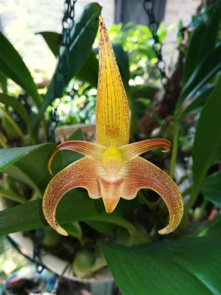 この株はBulbophyllum lobbii 'Kathy's Gold' AM/AOSという銘がありまして、入賞花の分け株らしいです。銘にゴールドと入ってる割に赤みが強く、ゴールドっぽくないのですが、入手時の花芽から開花したのは黄花のラッパズイセンのような色の花でした。