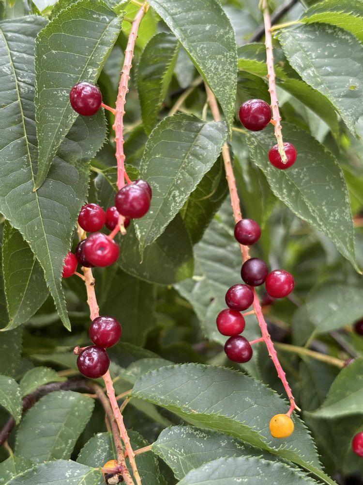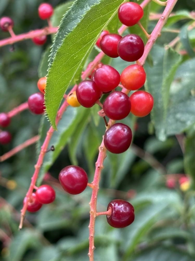 先月まだオレンジ色の多かったウワミズザクラの果実は赤みを増して艶々♡