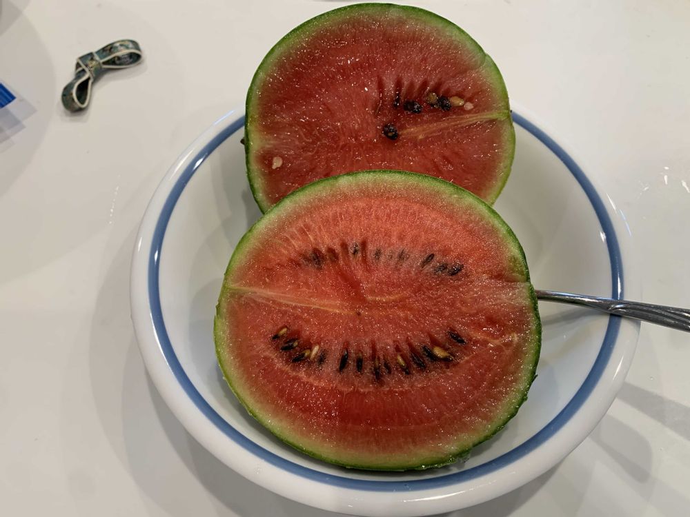 春先に収穫して食べたスイカの種から今、ちょうど収穫期に入りました。