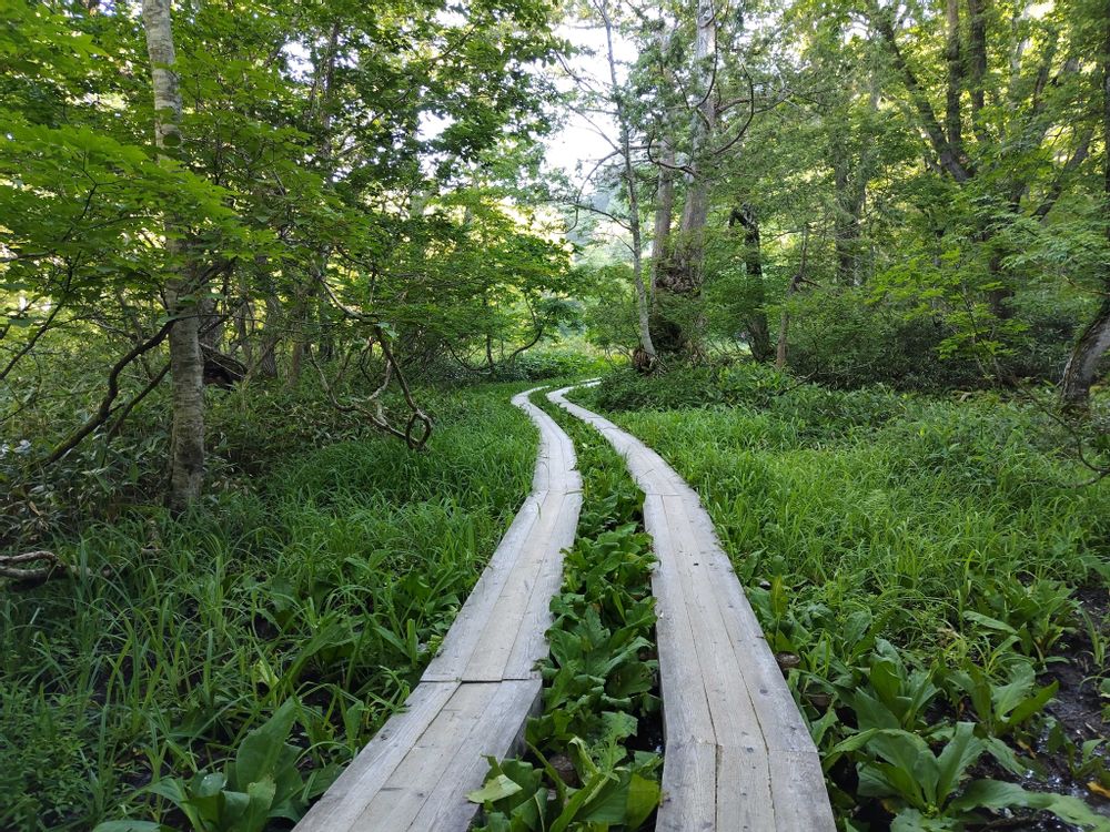 ブナの樹林の中に敷かれた木道を気持ちよく約1時間ほど歩きますが、途中に沢があったり水芭蕉の群生するエリアを通ったりととても気持ちいいです🎶