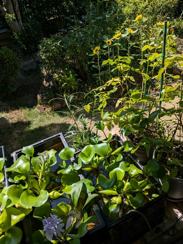スダレとメダカ水槽のホテイアオイで涼んでね👍🤗🎶