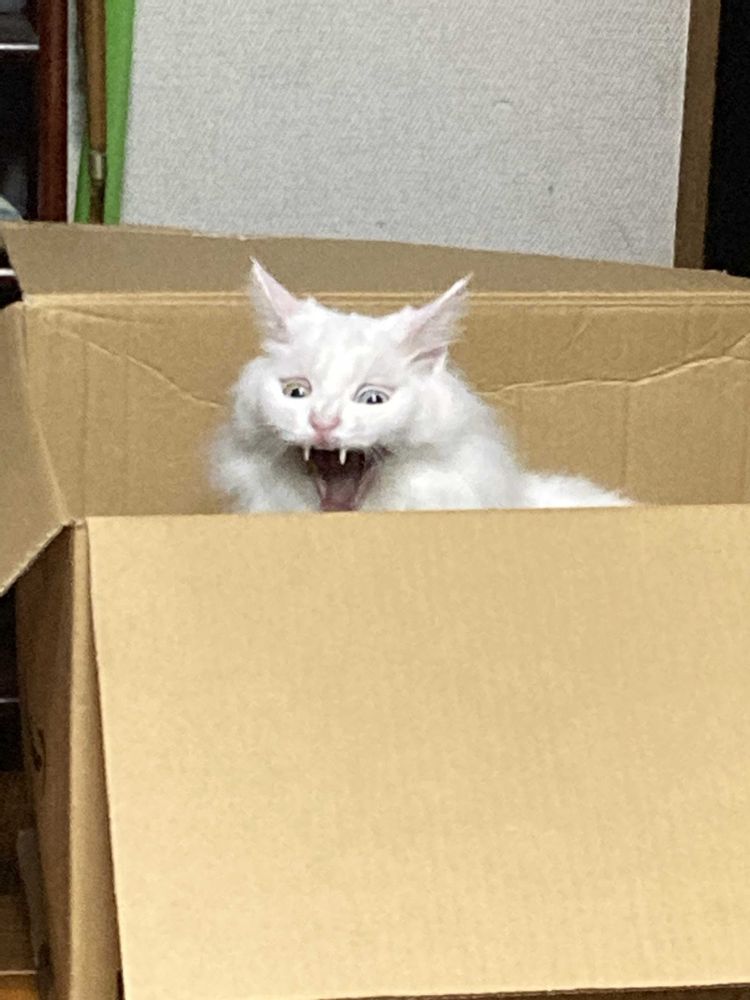 この直前に、Amazonの箱入り娘をしていたので、スマホ📱を構えていたら、欠伸をしたので撮影してみたところ、目を剥いて鋭い牙が😱😱