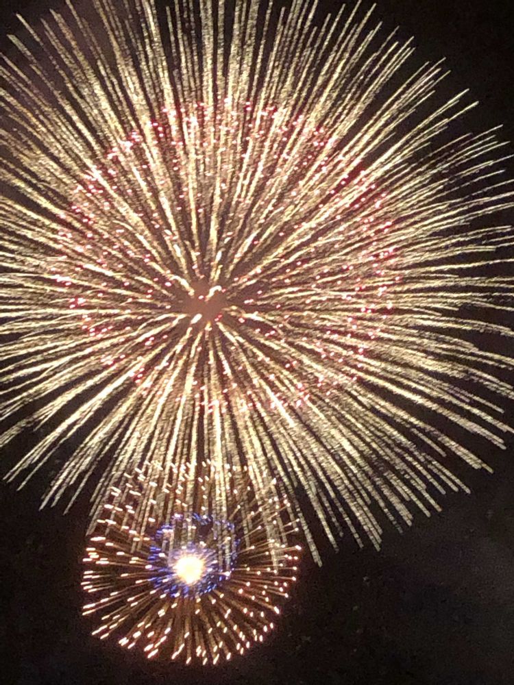 打ち上がると火薬が八方に飛び、菊の大輪のように丸く花開きます。そして光の一粒一粒が、菊の花びらのように長く尾を引いていきます。🌃🌌💛✌️