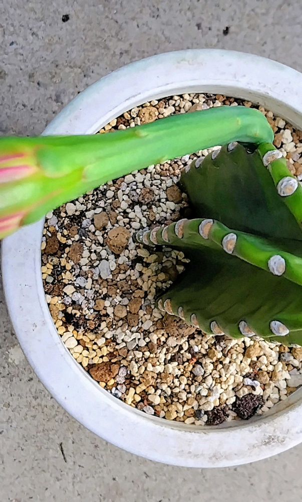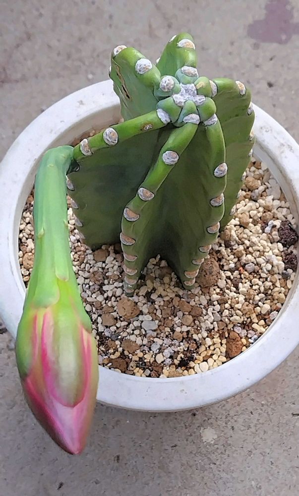 先日のガレージのお直しで 棚の上に置いて忘れてしまい すっかりスリムにしてしまった ケレウス・鬼面角さんの蕾ちゃん😻💚🤍❤️