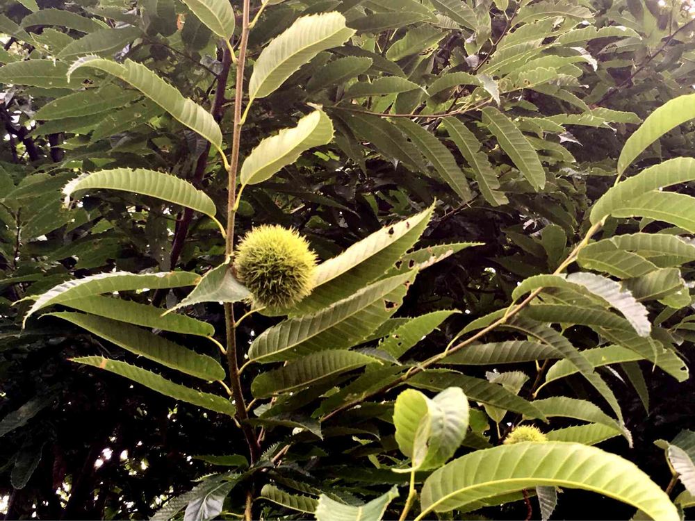 5/30の投稿で、皆さんに「クリ」だと教えていただいた木に、しっかりと🌰イガイガがついていました😊