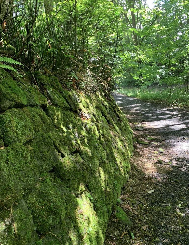 苔が生えた石垣のある散歩道 涼しそうでいいですね〜😊お寺さんとかで苔を見ると緑の美しさにハッとすることがあります。