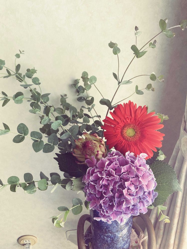 紫陽花の色、紫陽花にも負けない赤のガーベラ,ユーカリの葉に蕾のプロテア