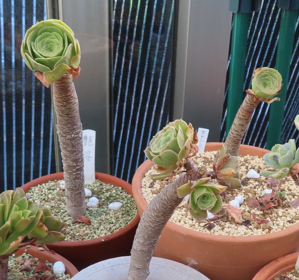 ギュッと締まって暑さに耐えているアエオニウムたち。冬になると大きく開いて,のびのびとした姿になるのが,この夏の様子からは想像できない。