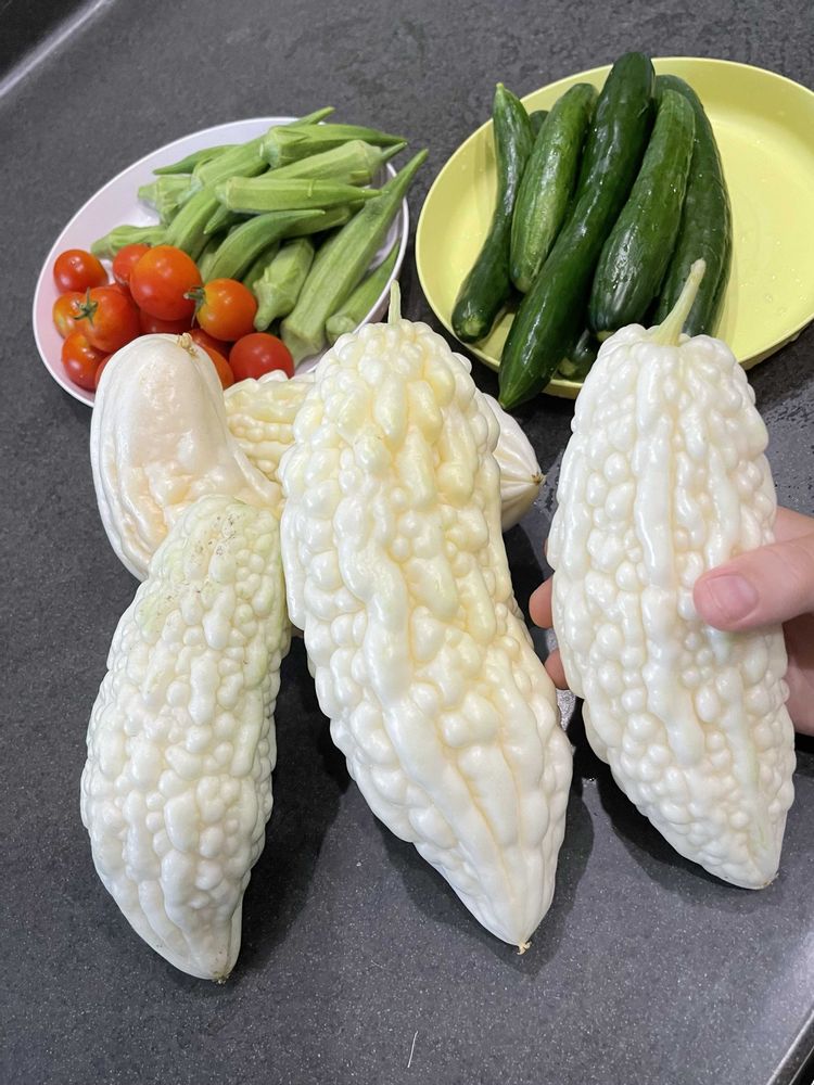 ✌✌私も真っ白なキュウリ初めて、パンに挟んで食べたよ、ゴーヤはレイシの長〜い青いのが1番苦いよ昔からのだからね途中から丸みの死榴弾みたいな形になり苦味薄れてる、白色は特に苦味無いよ