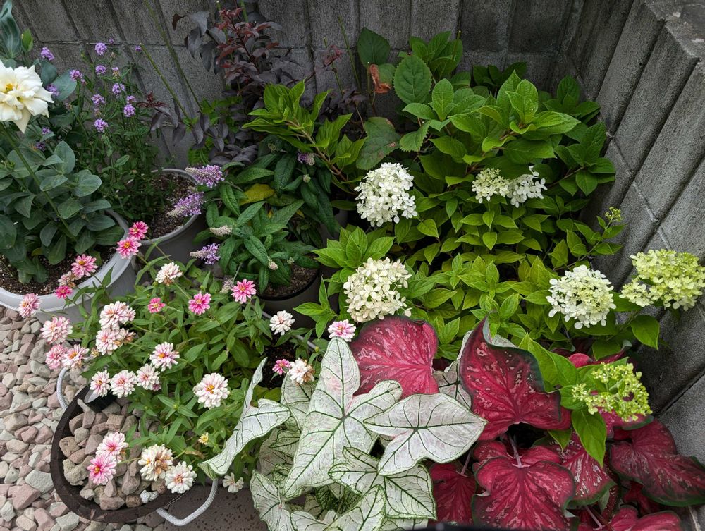 台風対策完了👍風に弱そうな背の高めの子達は庭の隅っこにギュッとまとめて、周囲をブロックで囲みました。こんなもんでどうでしょうかね…後は祈りますか🙏