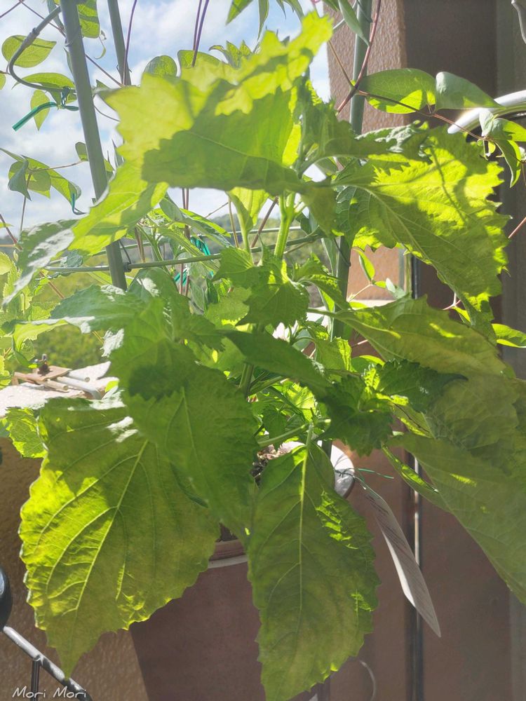 クレマチスの鉢に鳥が種を運んできたのか、紫蘇?が大きな葉を茂らせています🤗