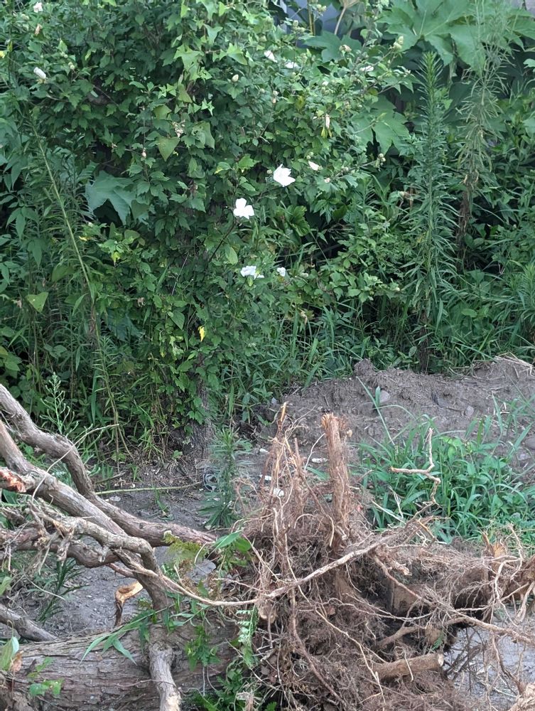 ムクゲと紙八手と庭から掘り出したスイリュウヒバ