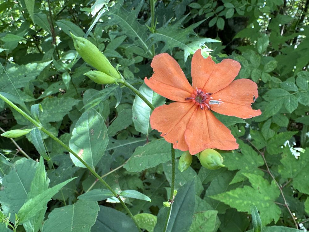 溝向こうの草むらの中に鮮やかなオレンジ色、フシグロセンノウですね😍