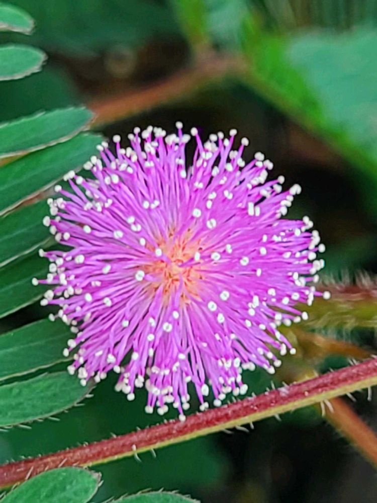 今年も零れ種から芽生えたオジギソウが花を咲かせてくれてます。