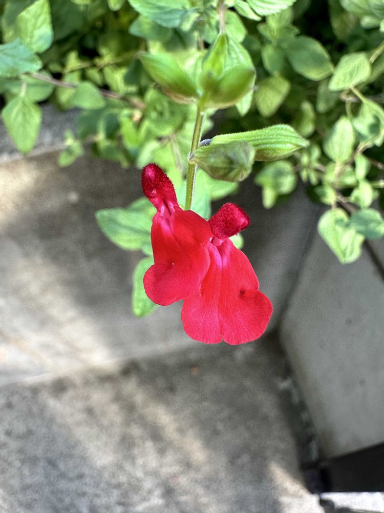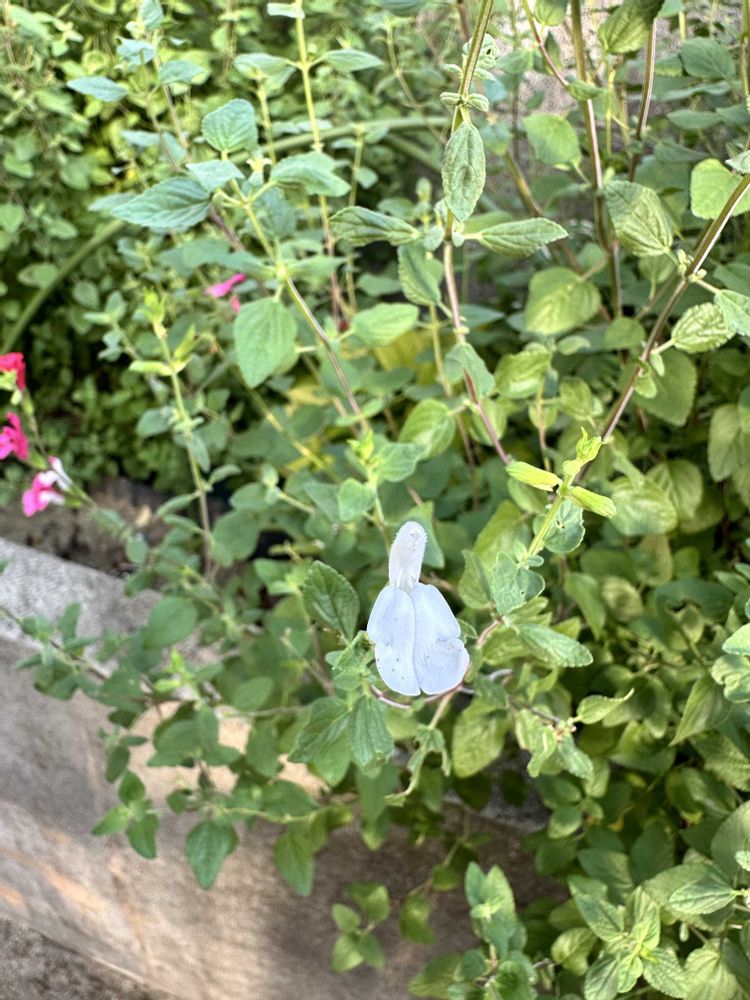 季節によってお花の色が変わるというチェリーセージです。お花自体少ないけど、今の時期は真っ赤!と思いきや、真っ白や、紅白のも1つ。お花も、あまりの暑さでおかしくなってるんですかね?