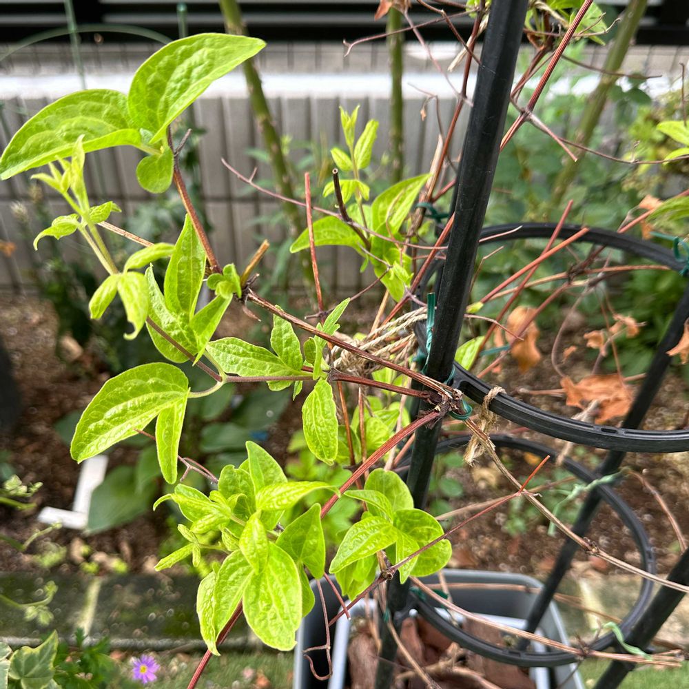 クレマチスは鉢の温度は上がらないようにするとどこかで読みました。もう一つ途中まで伸びて、枯れ込んできたクレマチスがあるので、二重鉢にしてみたらやはり翌日新芽が吹いてきたので、効果ありそうです!