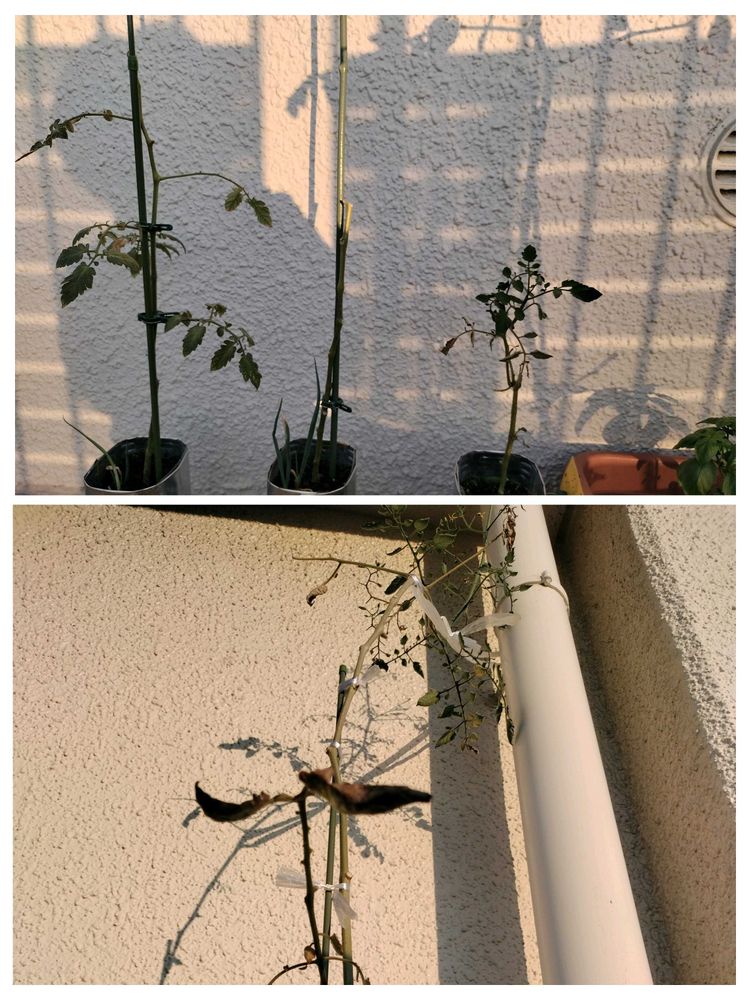 真ん中のペットボトル鉢は、やっと脇芽が出てきた。