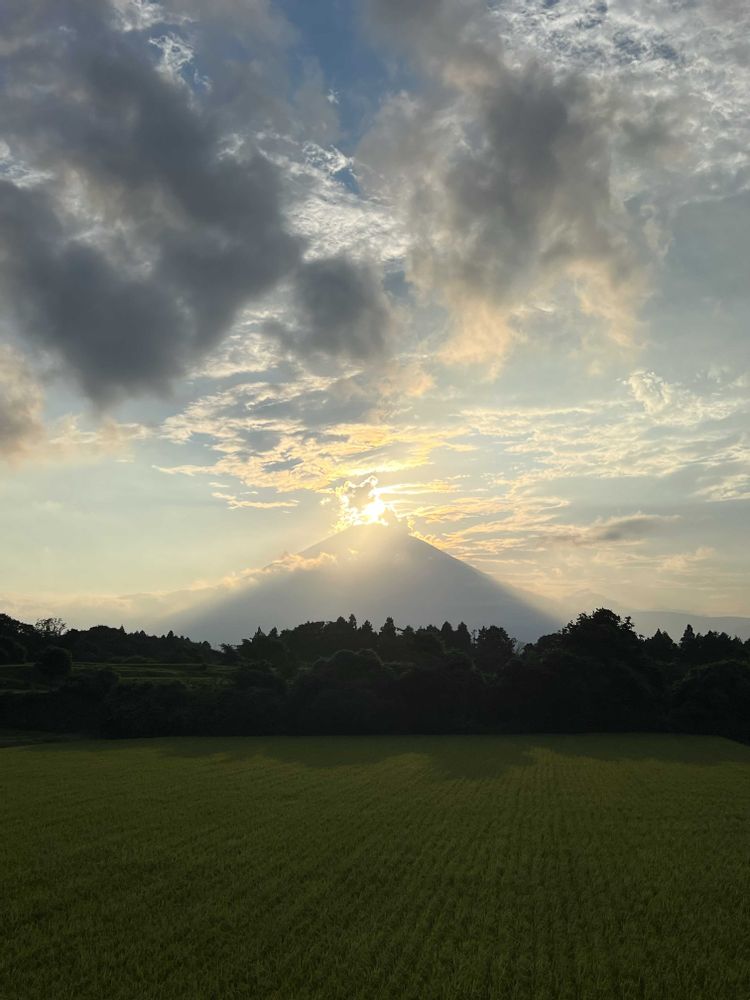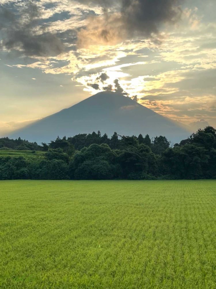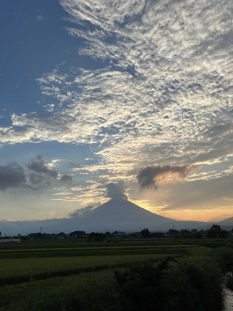 夏らしいステキな💓夕焼け、と、富士山〜!雲と手前の畑・田んぼとが夏らしいと思うポイントでしょうか!夏も悪くない、と思えました☺️