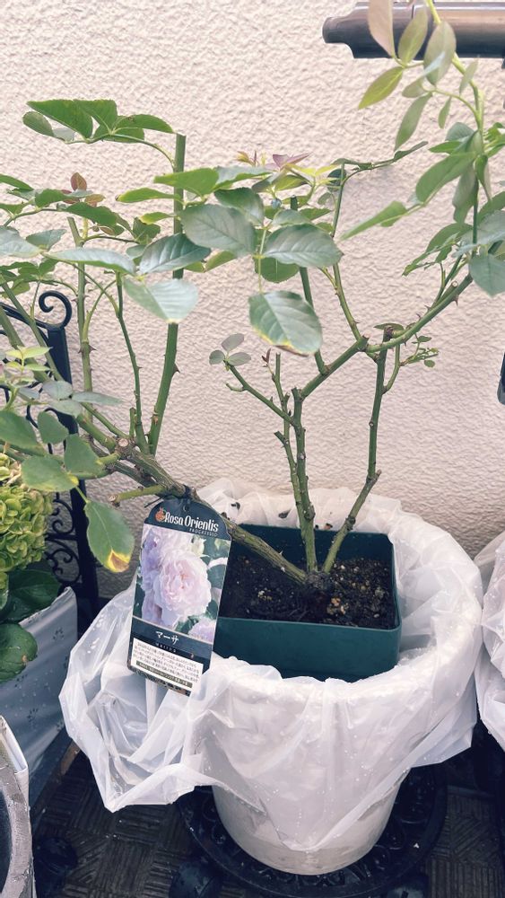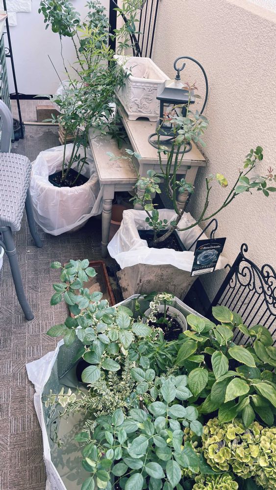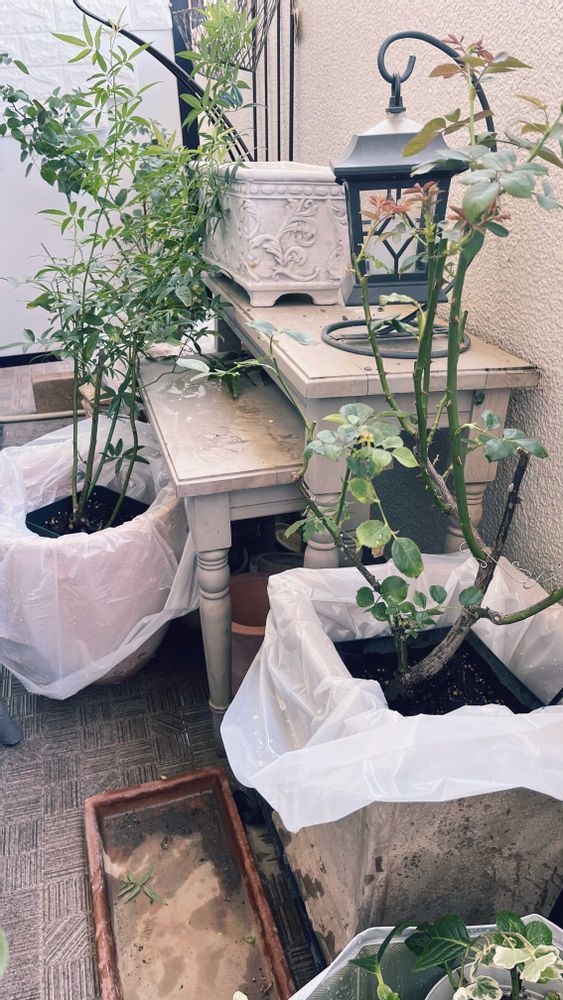 昨年と同じく鉢カバー代わりのテラコッタの大鉢にゴミ袋をセットとして水を張り🥀6号プラ鉢をチャポン。