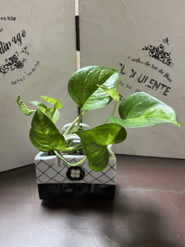 姉作ポーセラーツバッグにポトスを入れ部屋に飾ってました✌️