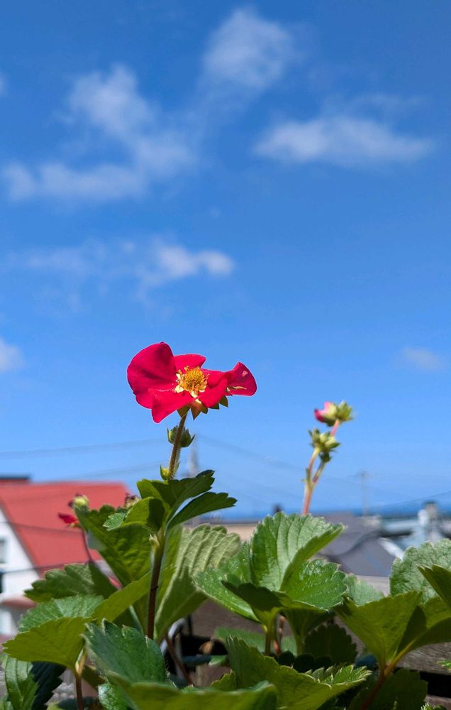 青空💙をバックにいちごのお花🍓