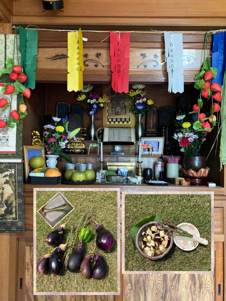 🍆7個 🫑1個 長ネギ2本 ミソハギを束ね