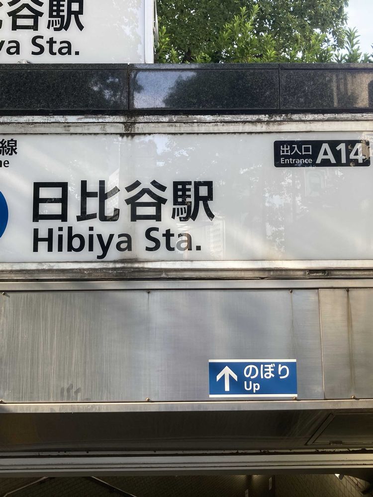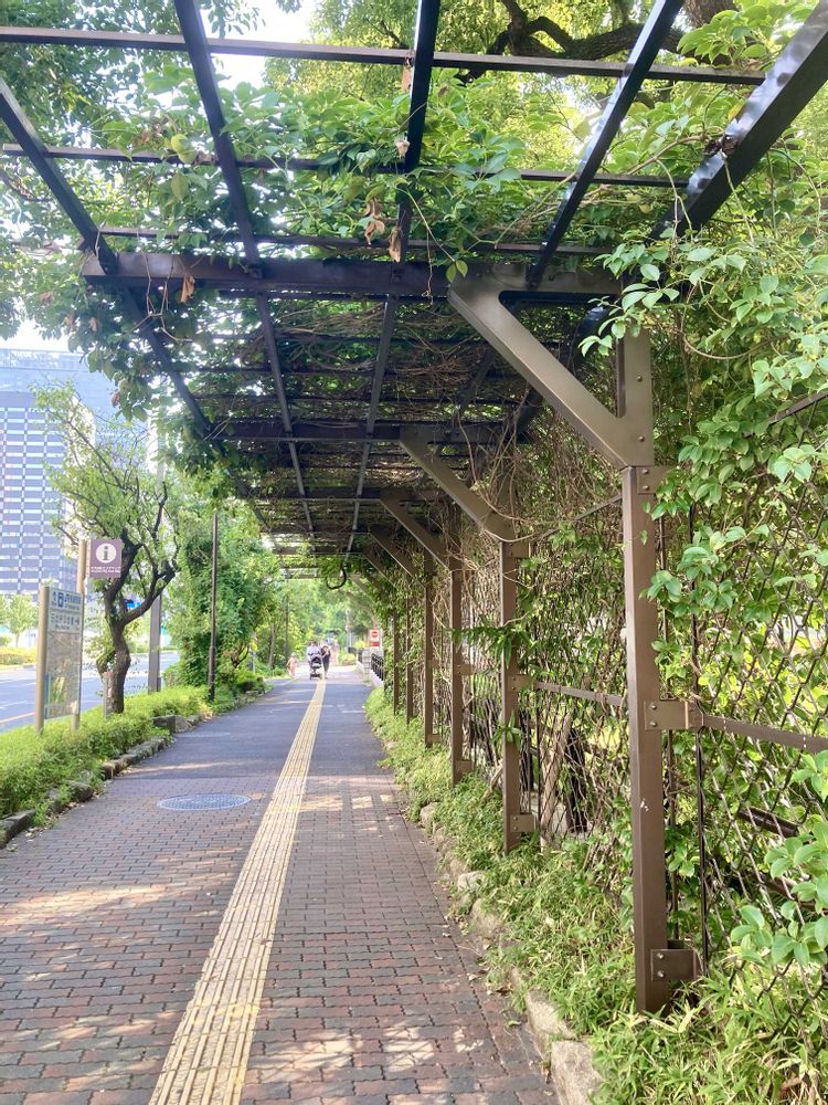 日比谷駅出入口A14を出て右方向を見ると「ムベ」と「フジ」棚の木陰が見える。