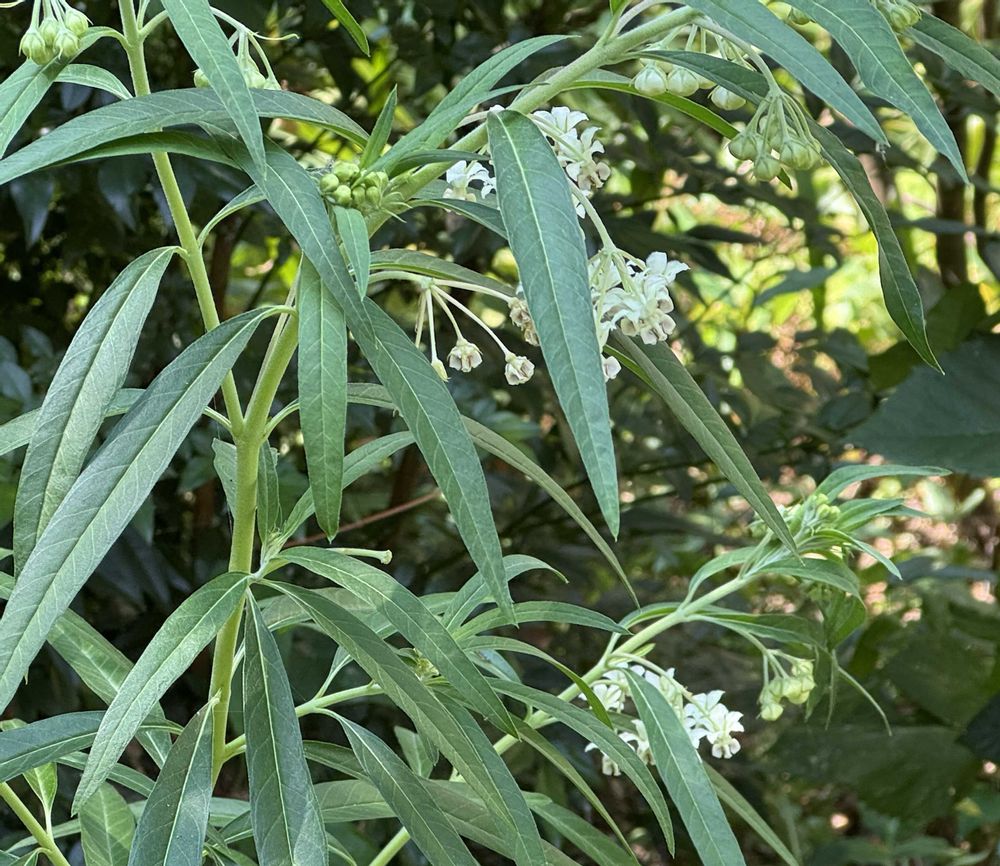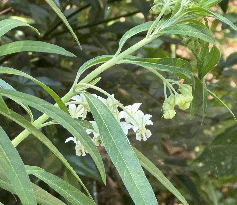 葉腋から花柄を伸ばし、反り返った花弁をもつ乳白色の花が集まり、下向きに咲きます。紫色の副花冠には蜜がたまるので、アリが寄ってきます。果実が成熟すると縦に裂け、ワタというよりもむしろシルクのような冠毛のついたタネが飛散します。