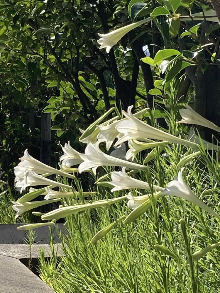 道端のアスファルトの隙間から、幾つも素敵な白い花姿を見せて咲き誇るテッポウユリを良く見かけます