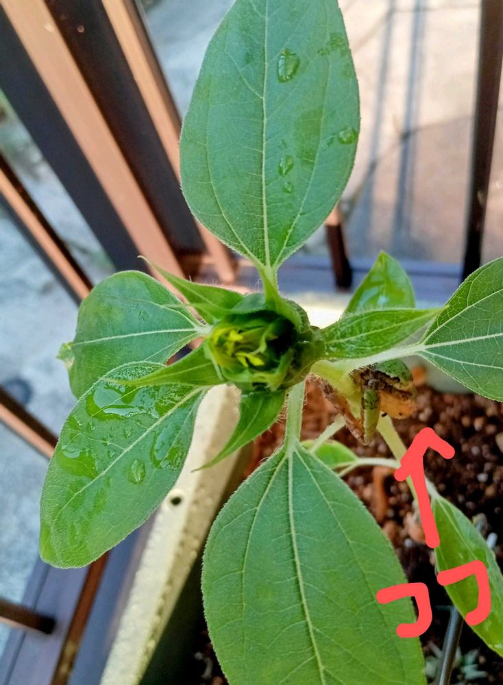 ヒマワリが今朝は黄色い花びらをチラッと見せてくれてます🤗