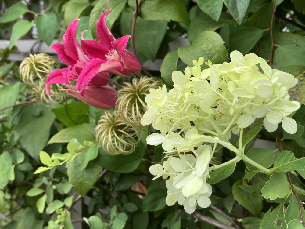フェンスに絡めた早咲きのクレマチスが、日陰を作ってくれています!