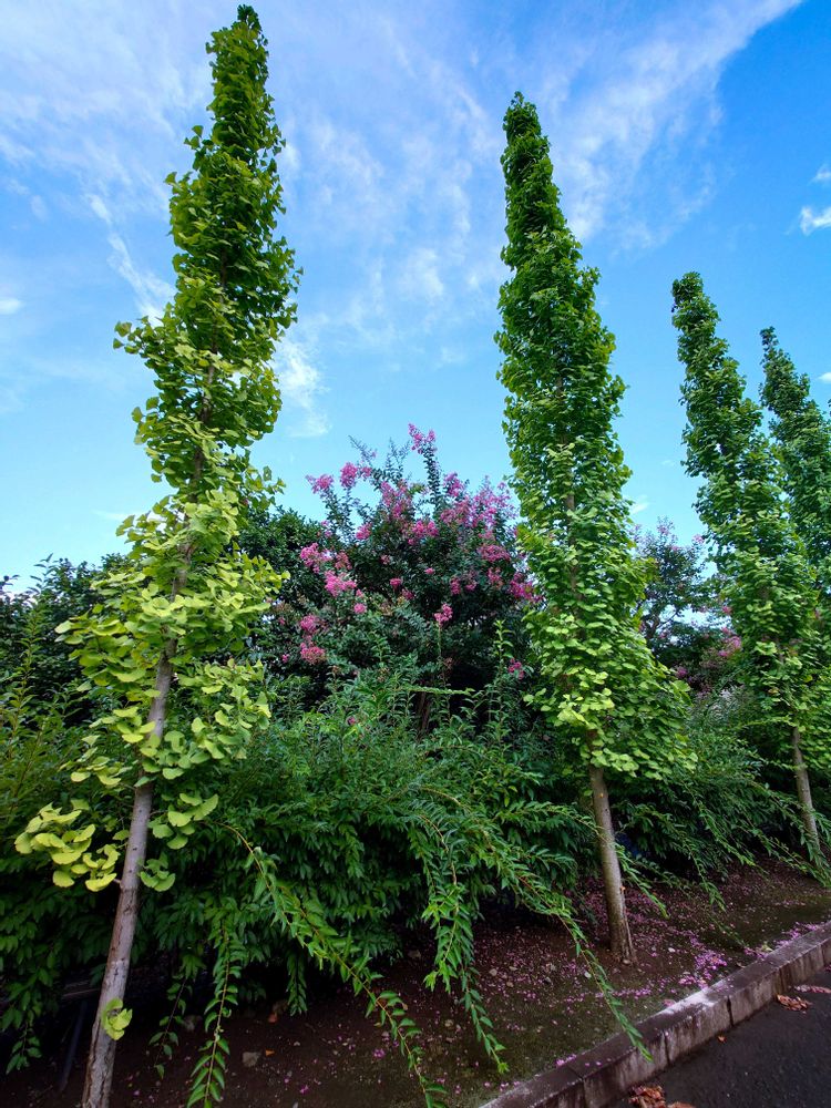今日のお花、とんがりイチョウの木にはさまれたピンクのサルスベリです😀 土砂降り後の昼下がりに撮りました📸(農業試験場内にて)