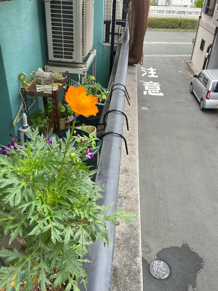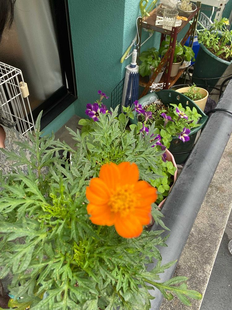 緑道に咲いていた、黄花コスモスの種をとっておいてまきました。一階のは枯れたけど2階ベランダのは、本日咲きました。嬉しい😀
