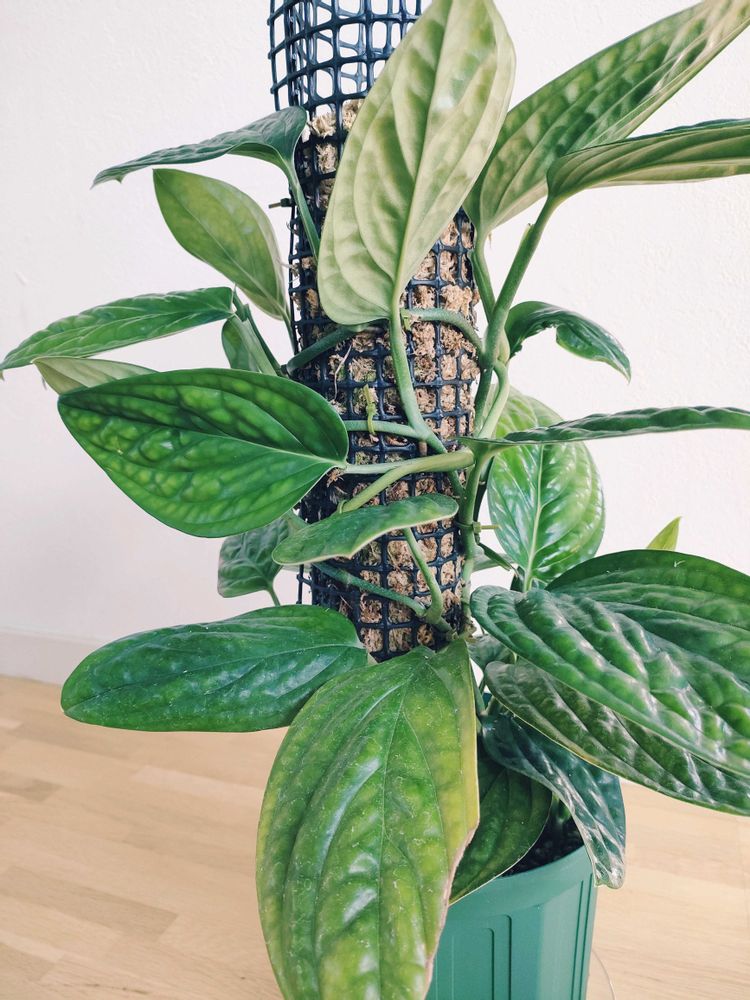 モスポールにしたジェイド シャトルコック(2024.05&07pic)、気根も水苔に入り込み、とっても順調😉私はワサワサに仕立てたいので、必ずしも上に伸ばすのではなく、巻き付けながら隙間を調整しています😊