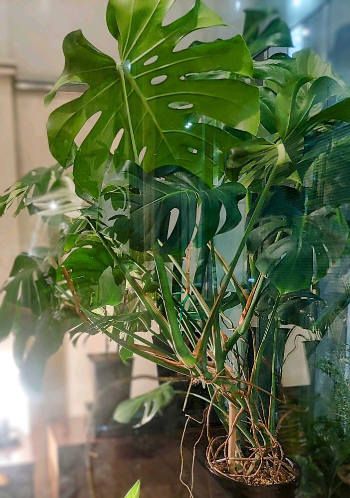 モンステラ くるくるしててもほんのちょっとの隙見てひん曲がります…😓家のも仕立て直そうと切ってた気根も別の場所から伸びた気根に追い越され 花火のナイアガラ状態です…
