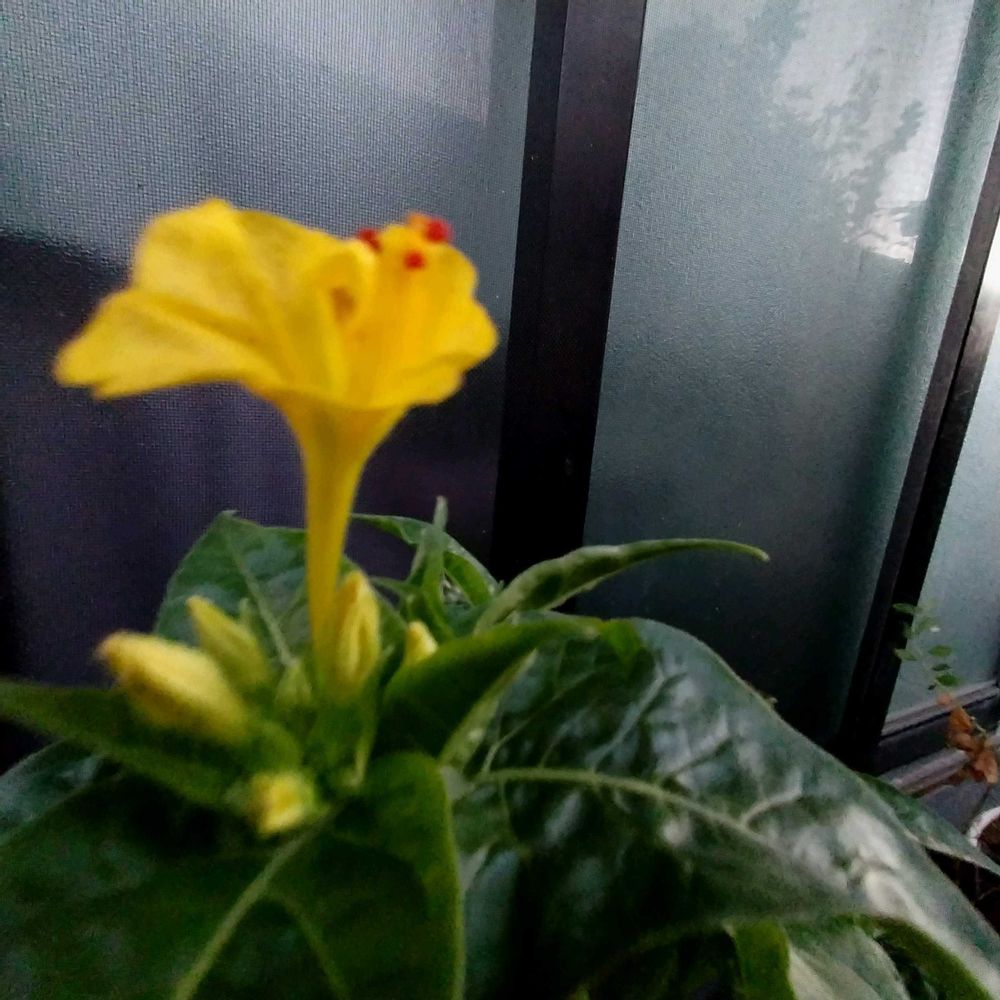 夜は…なかなか…上手く…撮れませんが…北側…のベランダのオシロイバナ初咲きでしたょ…💛🌿💛🥀💛💛🌱黄色い花びら💛赤い蕊が可愛い…ゎ…🥀😊💞