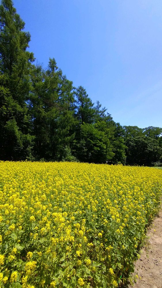 夏の青空の下、樹木に囲まれて菜の花畑が広がり、とてもきれいな光景です(^o^)