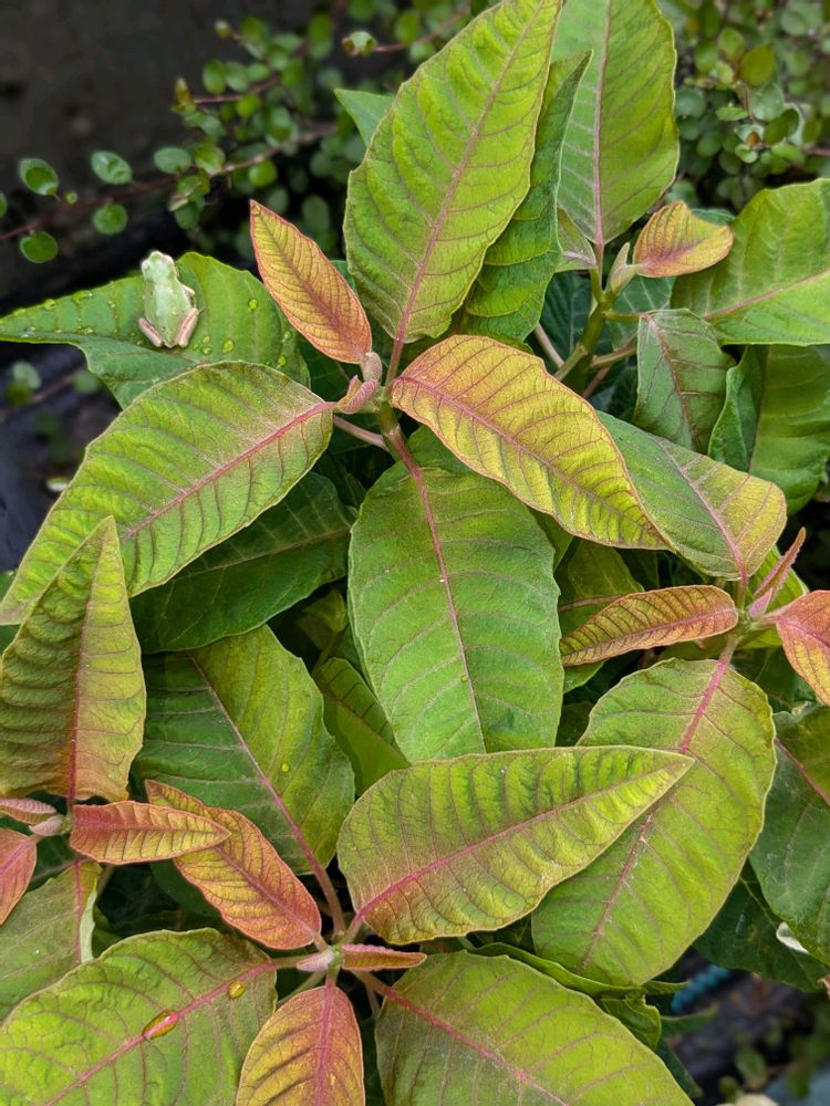 ③プリンセチアとカエル🐸ちゃん❣️水やりしてたら、この辺りから2〜3匹出て来るのが楽しみになってるよ〜🎶🎵♪✨💕💕