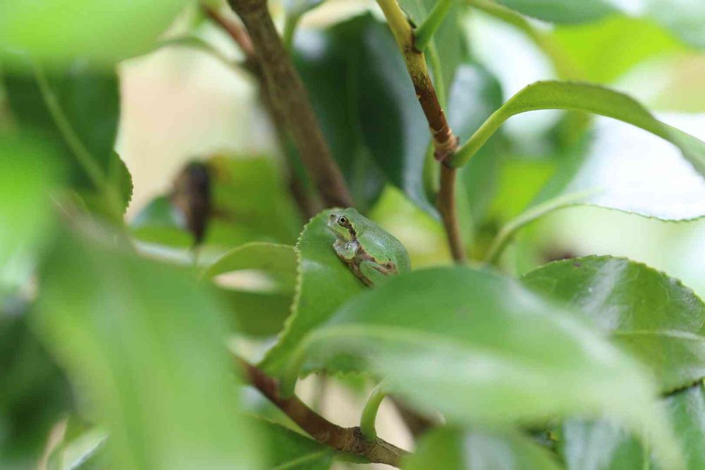 おはよう🌞ございます、ツバキの葉っぱに 赤ちゃん 🐸カエルが ひかげ で 休んています〜ケロ🐸。