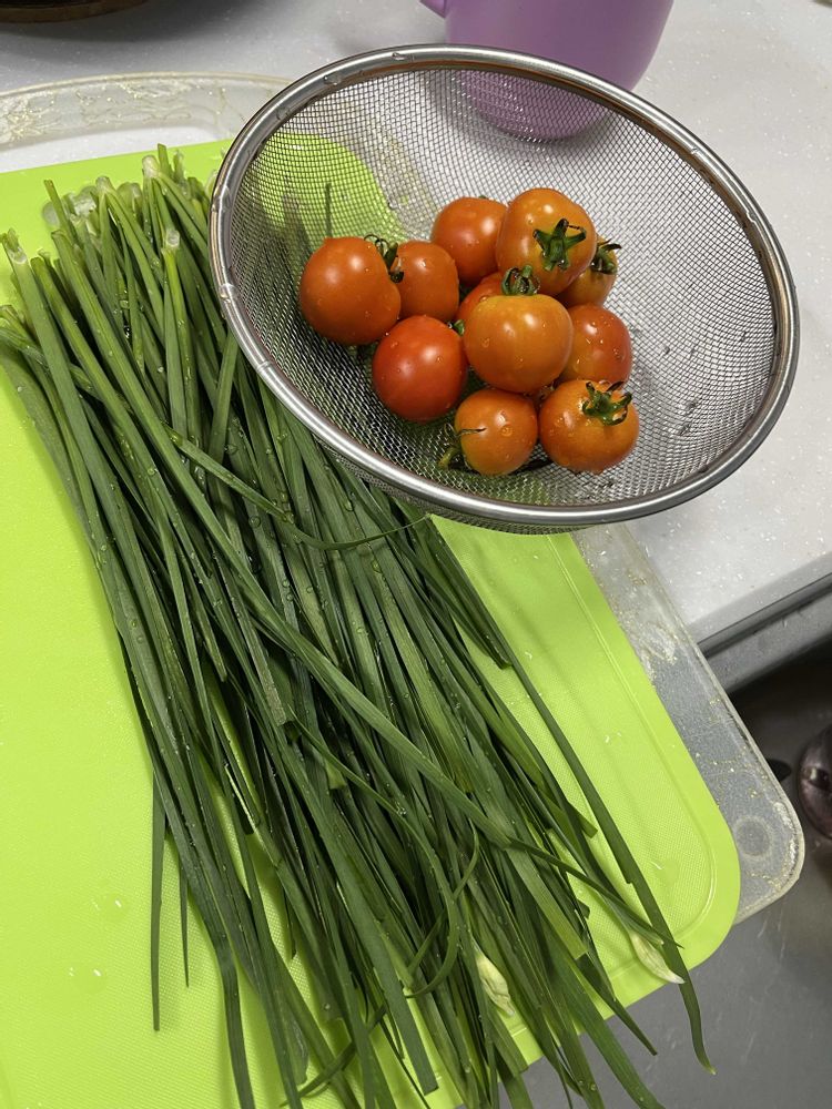 トマトは冷蔵庫へ、ニラは細か目に切って冷凍保存へ👍