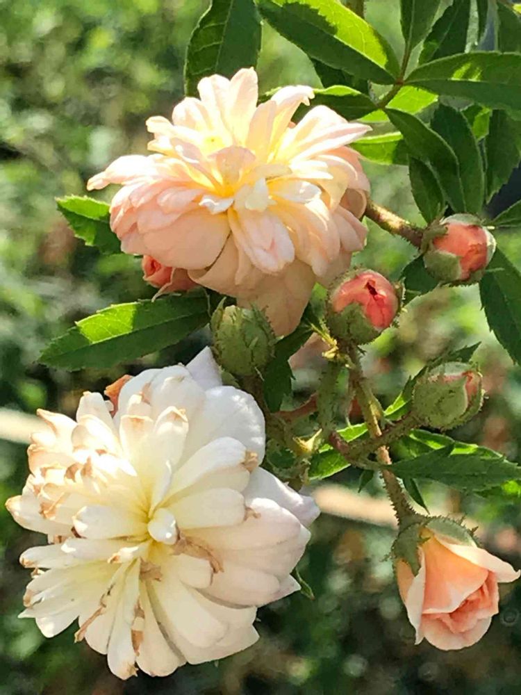 このギスレーヌ は、新苗を迎えて3年目くらいですかね。今年の春は本当に見事に咲いてくれました。その後、返り咲きもぽちぽちと。とにかく春の花は白、クリーム、黄色、アプリコットの花が混ざり合い可愛かったですよ✨太いシュートが出ますので地植えの場合は場所確保されると大きく茂らすことができると思います❣️