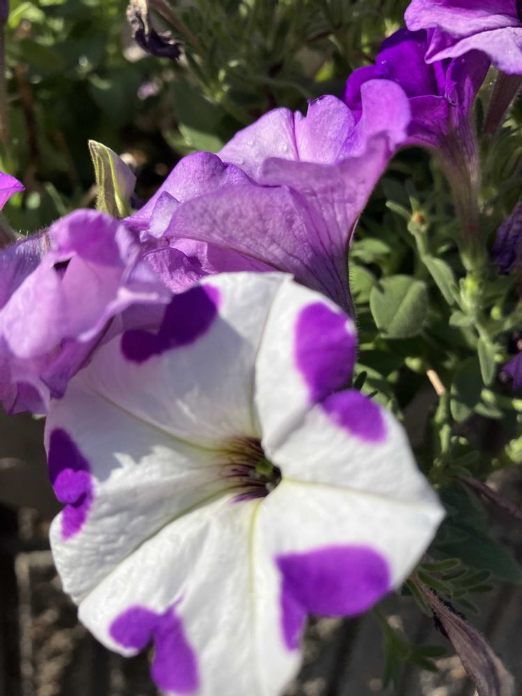 ペチュニア、色が不安定で色々な柄になっています😃ももいろハートのような柄の花を見つけました🩷