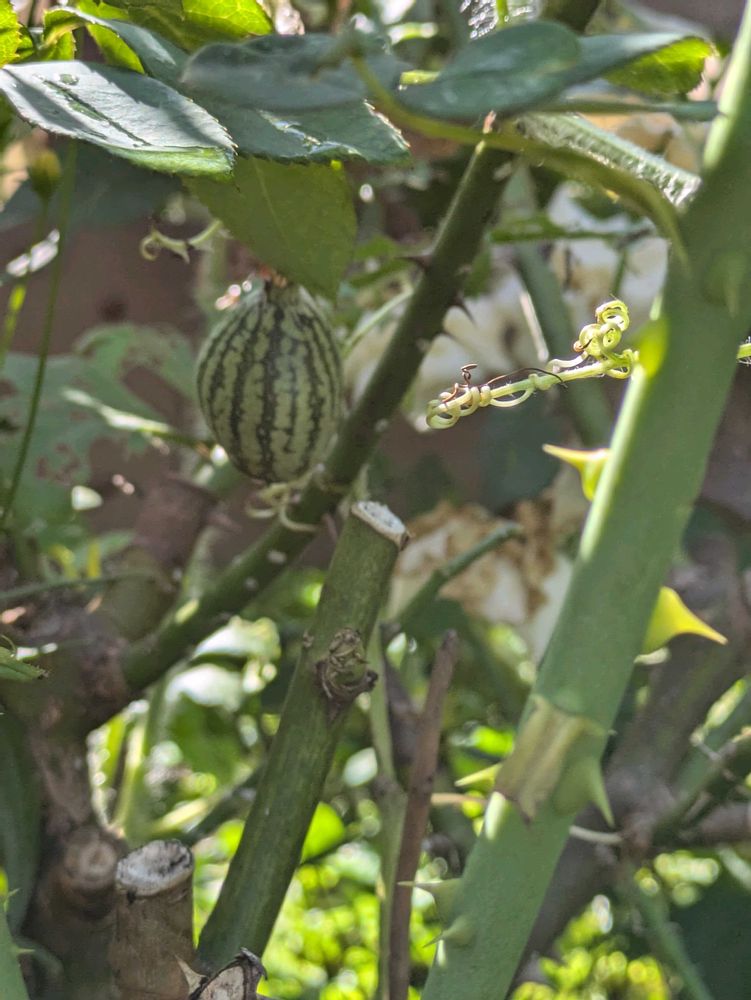 ミニ菜園のスイカを見たら、大きいのが1個に加え小さいのが2個…そして薔薇の枝に延びたツルにも