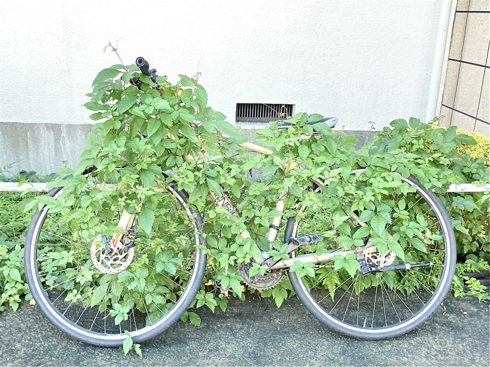 絵になる🚲程よく🌱がからみ合って。こういうのって、