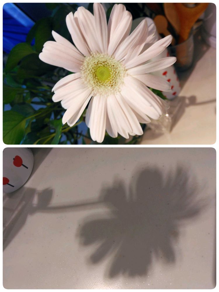 夜のイメージの白いガーベラと明るいイメージの影、面白いpicですね。ほんわか優しい感じます。🎁良かったですね。手拭いがかっこいい🤍❤️