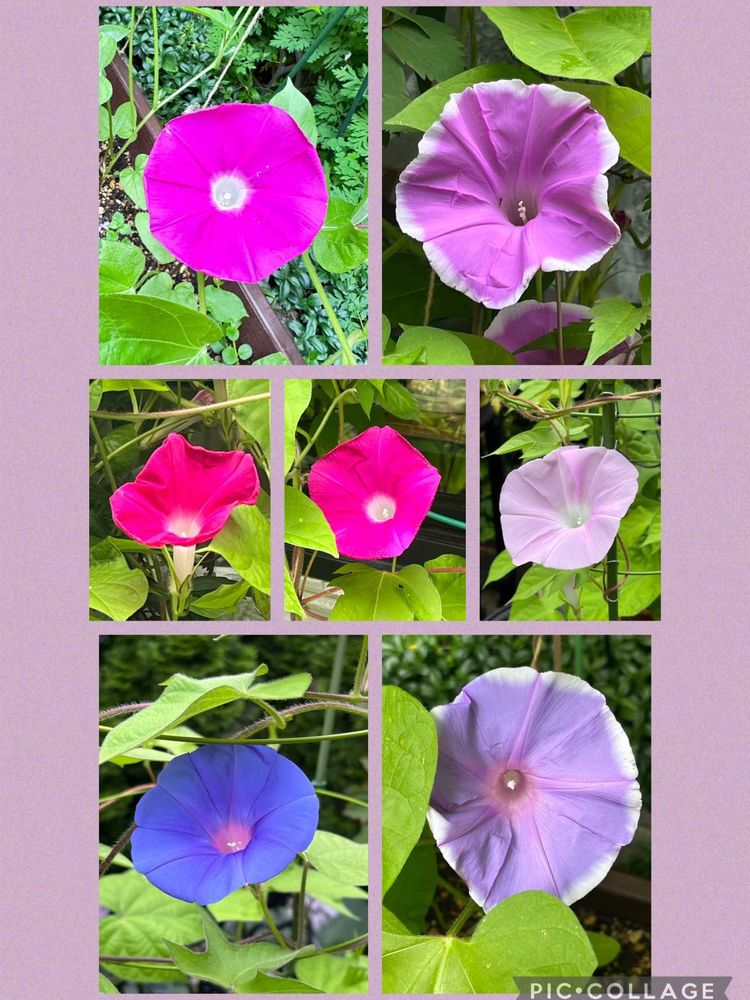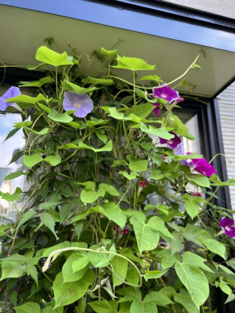 毎朝色々な色の花が咲いてくれます 手の平よりずっと大きい葉が緑のカーテンになって涼しげです