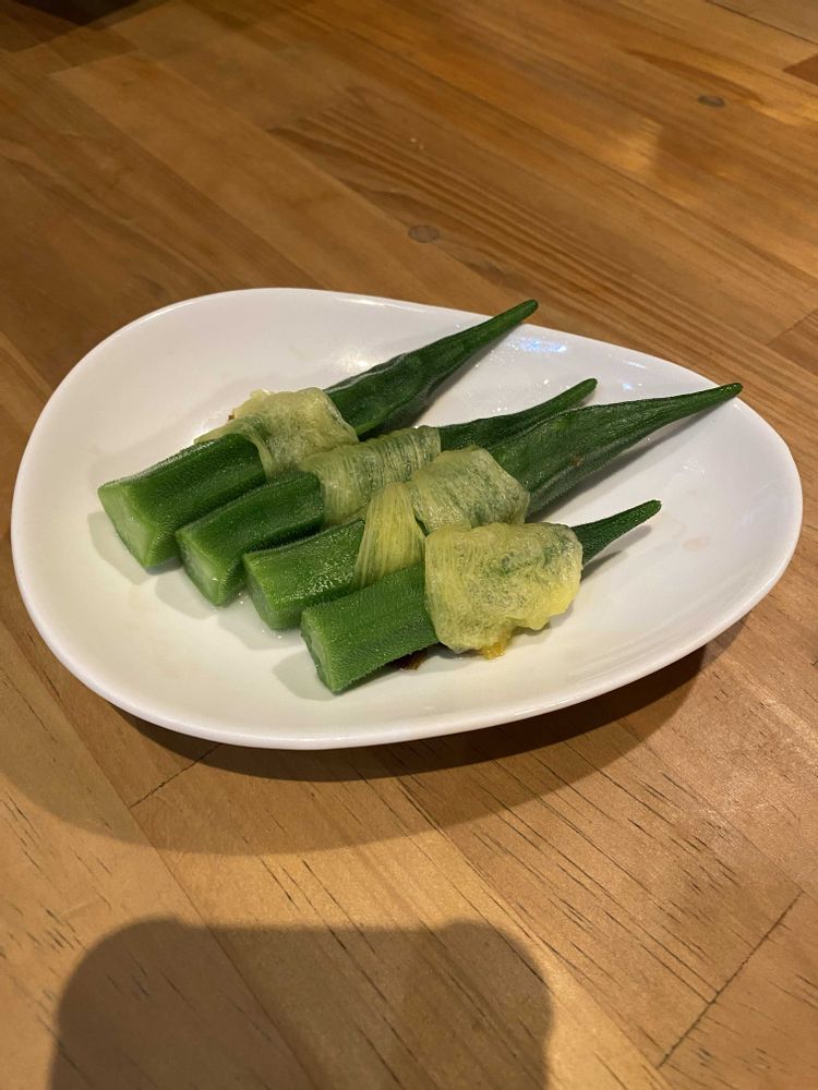茹でたハナオクラを茹でたオクラに巻いてポン酢で♪
