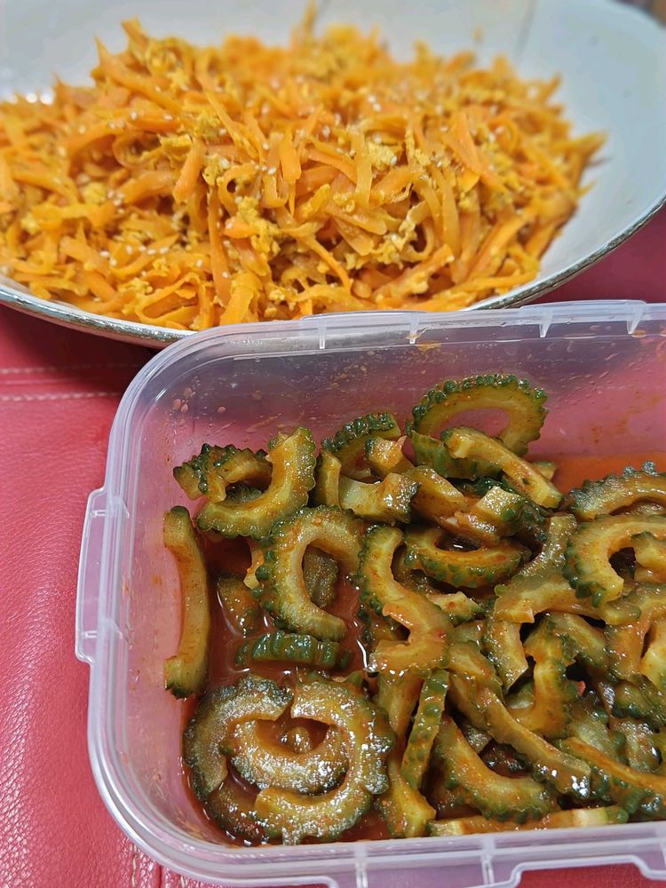 3枚めの常備菜は、甘めの人参🥕しりしりと、ゴーヤのキムチ。今年は味噌炒めからゴーヤ克服🤭何度も食卓に上ってます😋