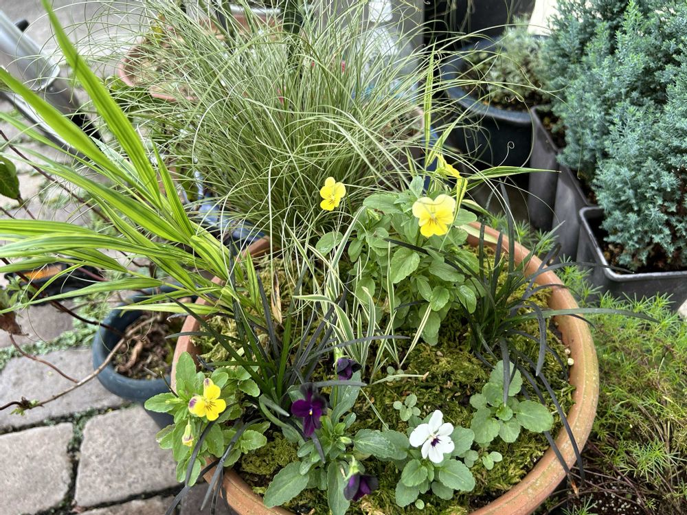 カレックス 、フウチソウ、黒龍、リボングラスなどの葉物の鉢にこぼれ種のビオラが次々に開花